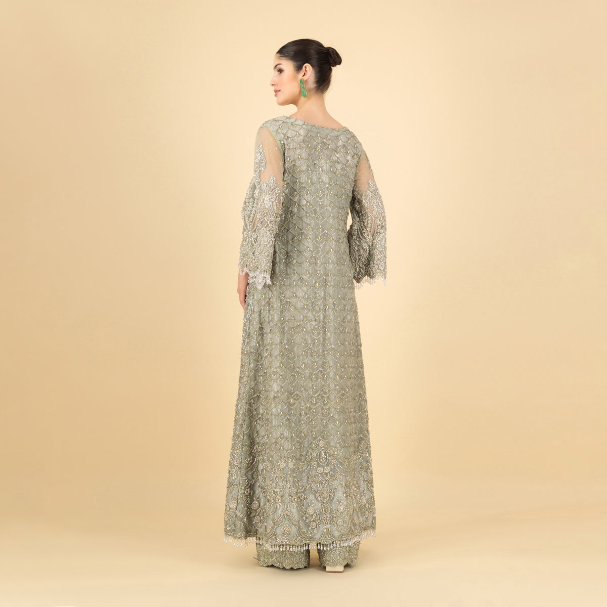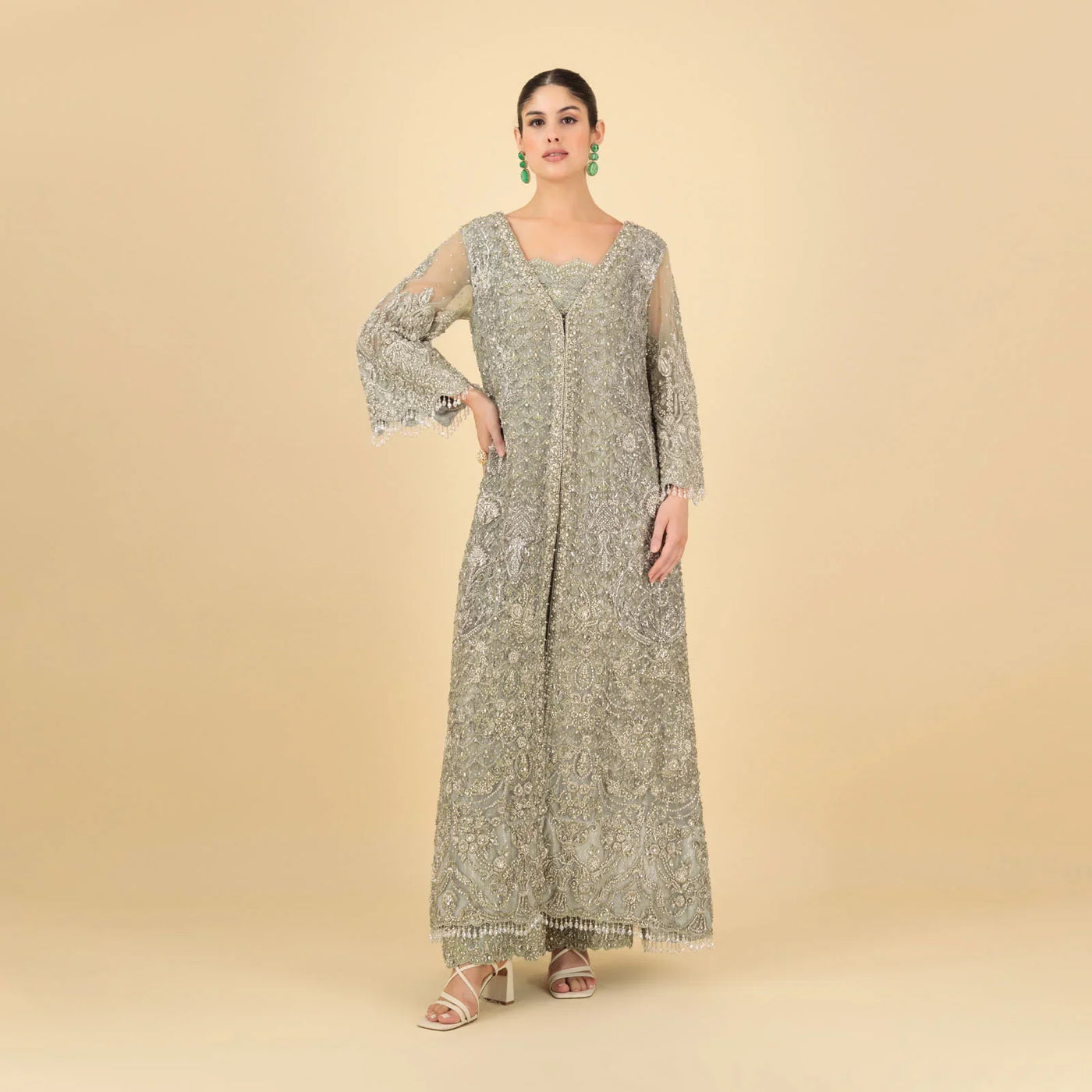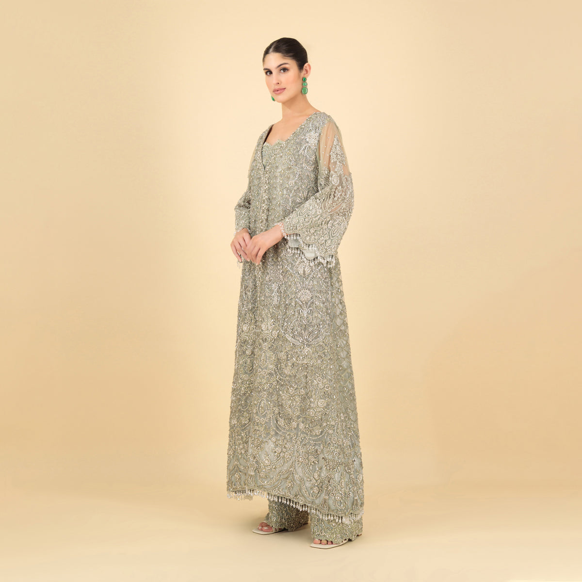 A breathtaking union of grandeur and finesse, Serene Gleam is an ensemble that encapsulates quiet luxury. At its heart is a full-length jacket, designed in an open-close silhouette that blends the fluidity of movement with the richness of super heavy embroidery. Every inch is adorned with intricate patterns that reflect timeless craftsmanship, while a delicate border traces the edges, adding definition to its soft, structured flow.
