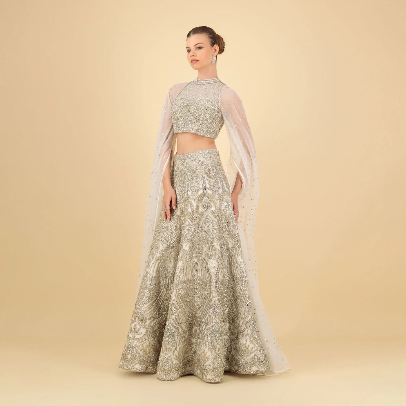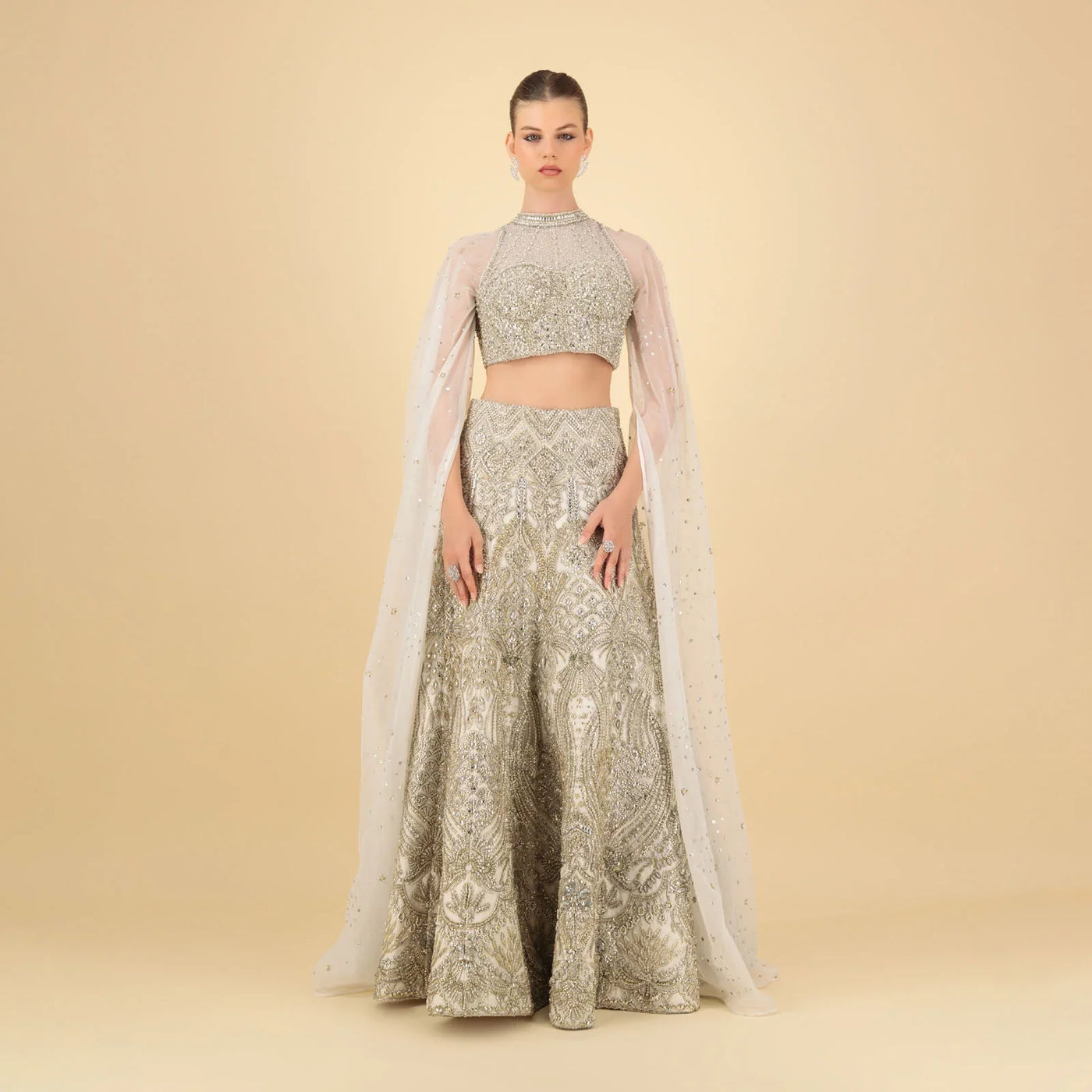 The contemporary halter-style blouse is crafted with a sculpted fit, paired with sheer embellished cape sleeves that cascade like gossamer wings—an avant-garde twist on classic elegance. The voluminous skirt showcases grand Mughal-inspired motifs, merging heritage artistry with modern silhouettes.