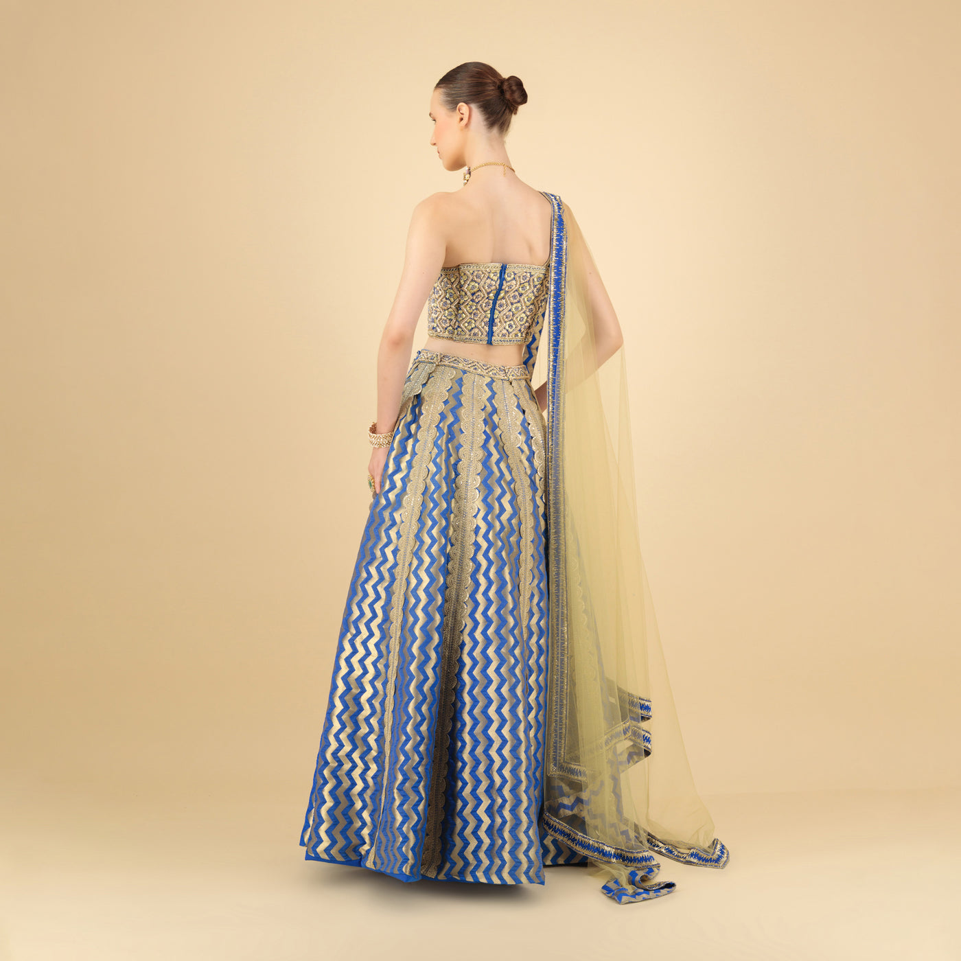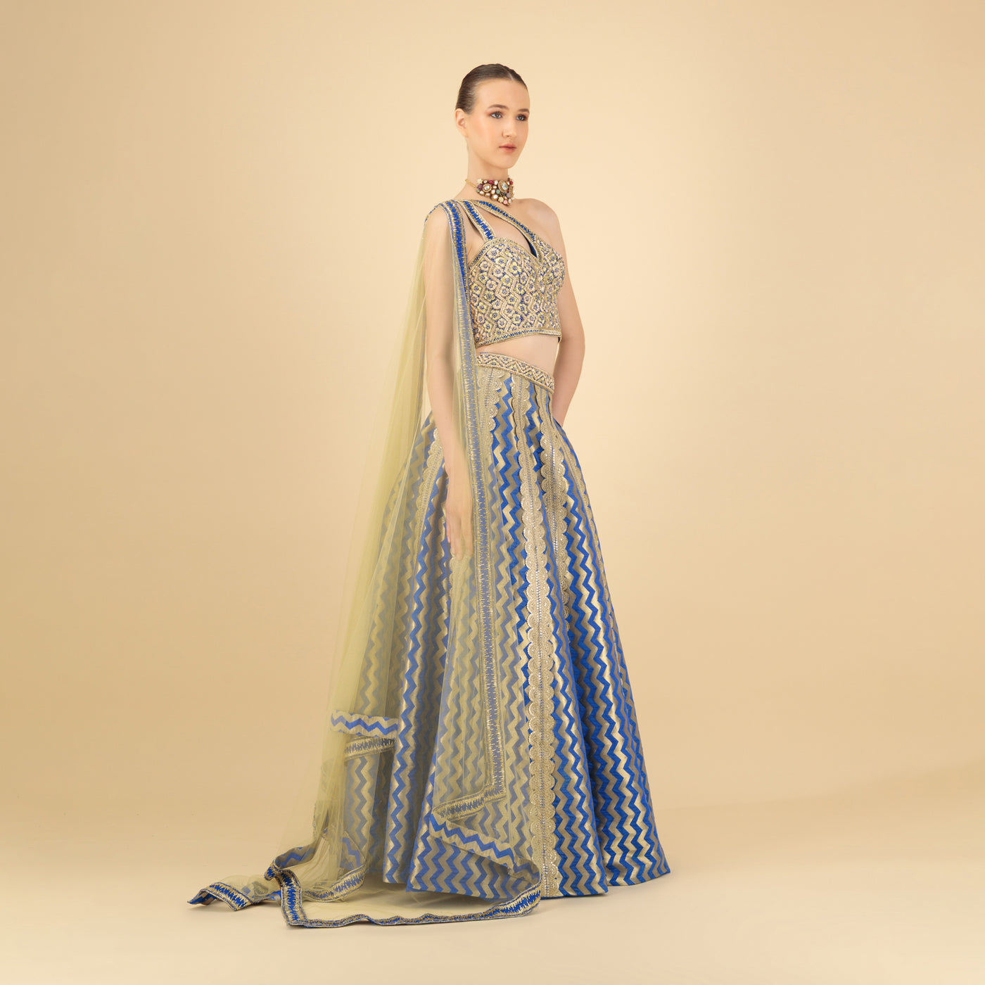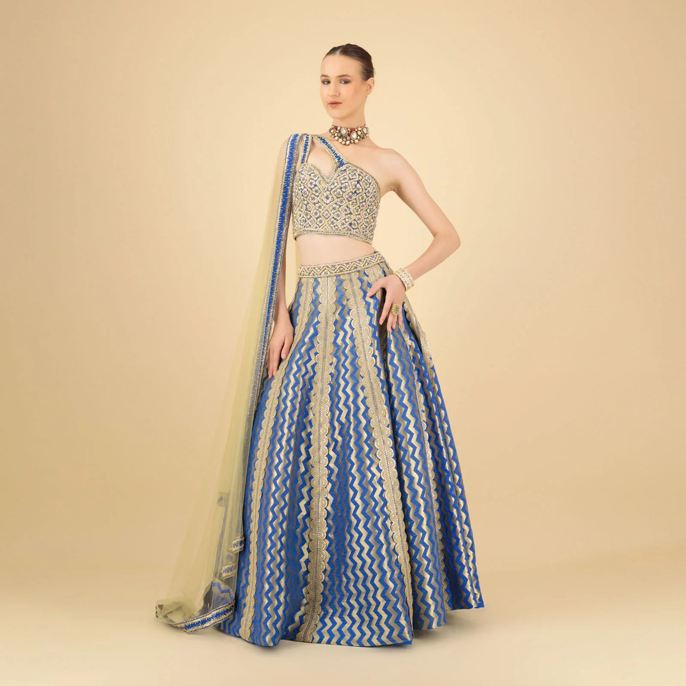 The look features a stunning one-shoulder blouse that adds bold structure to classic embroidery. Handcrafted with delicate threadwork and intricate detailing, it radiates confidence with grace. The star of the ensemble is the flared royal blue lehenga, brought to life by zigzag vertical patterns in luminous gold and silver embroidery. These lines not only elongate the silhouette but also create a mesmerizing movement as you glide through the room.