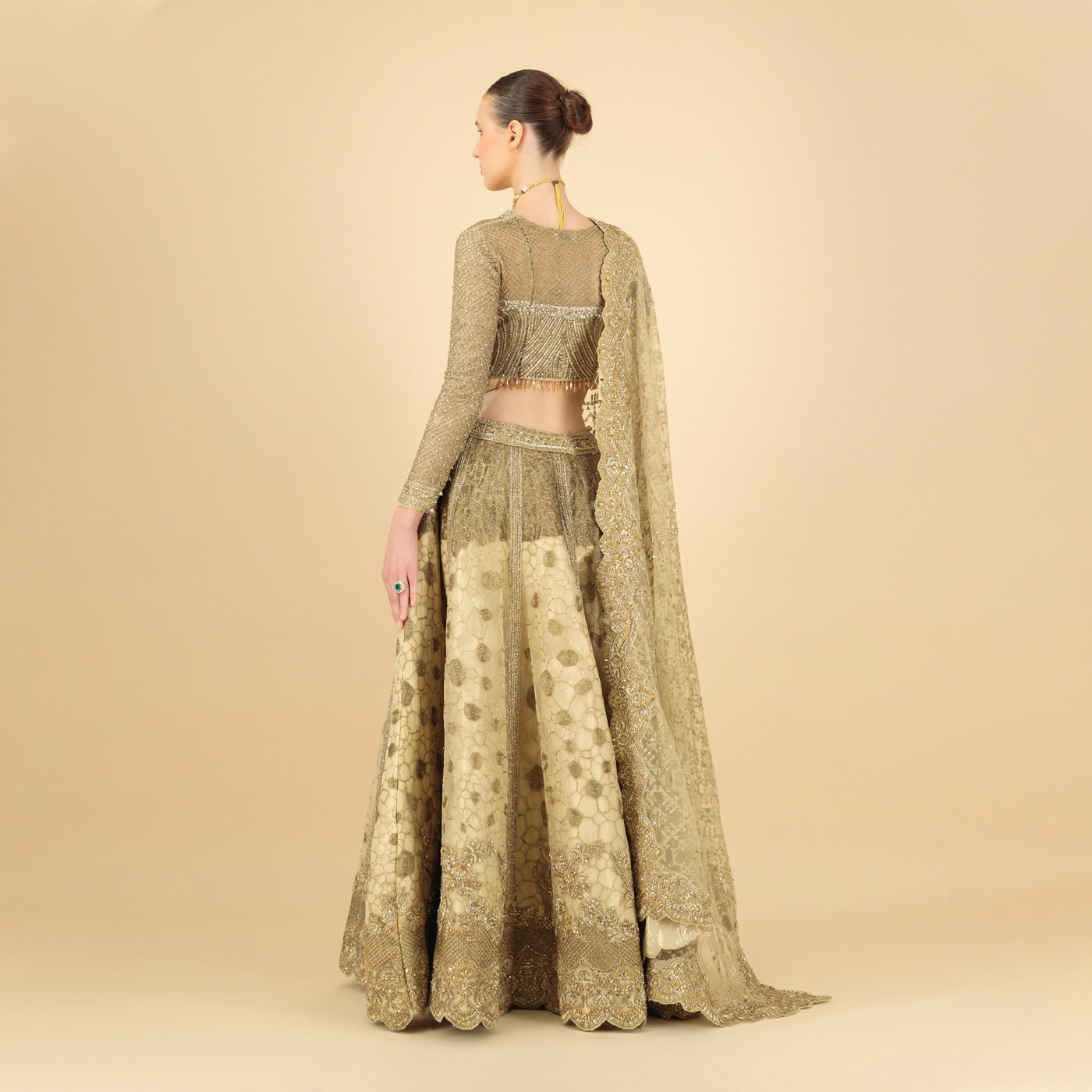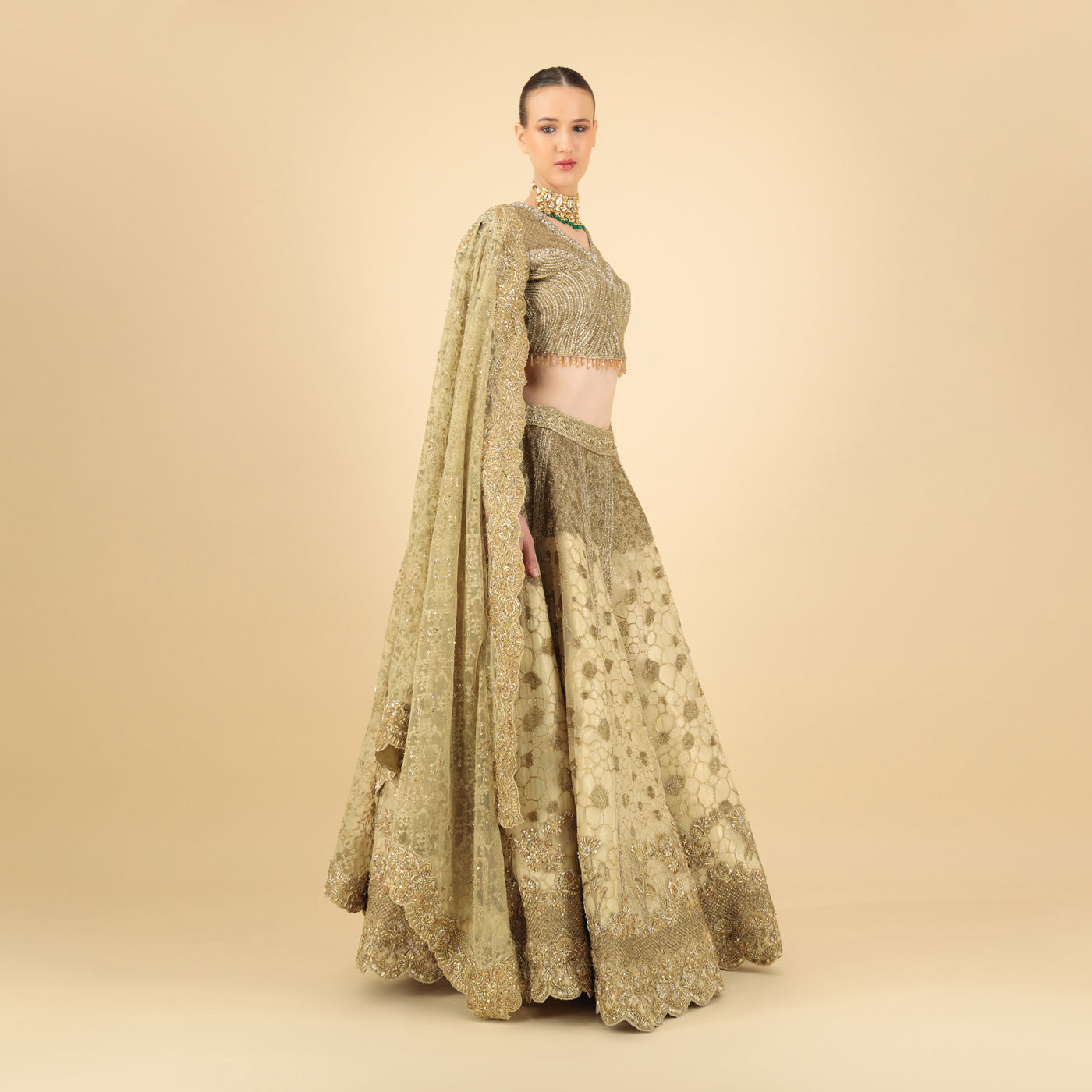 The long-sleeved blouse is sculpted to perfection, with a structured sweetheart neckline and delicate bead tassels that graze the waist. The lehenga skirt boasts exquisite geometric and floral patterns in champagne and antique gold tones, intricately layered to create depth and movement. Completing the ensemble is a matching embroidered dupatta with scalloped edging—an ethereal finishing touch that drapes effortlessly across the shoulders.