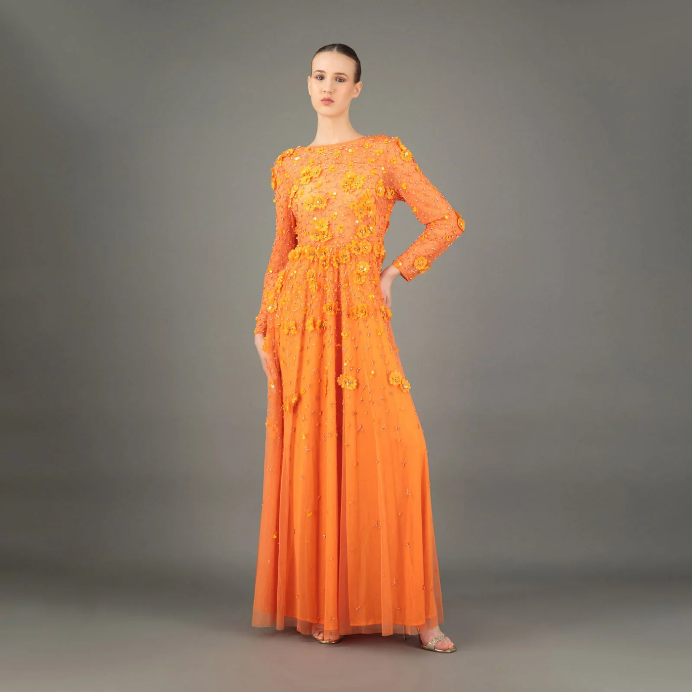 The Saffron Blossom is more than an outfit—it’s a radiant statement. Whether worn at evening galas, sophisticated soirées, or lavish functions, it transforms its wearer into a walking vision of floral opulence. Every angle tells a story, every detail reflects the legacy of couture craftsmanship.