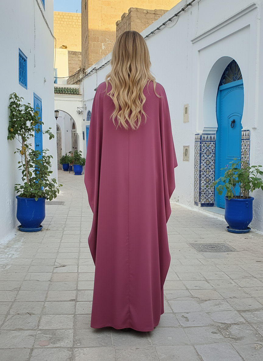 Sleeves: Full-length draped sleeves featuring high-slit shoulder details.