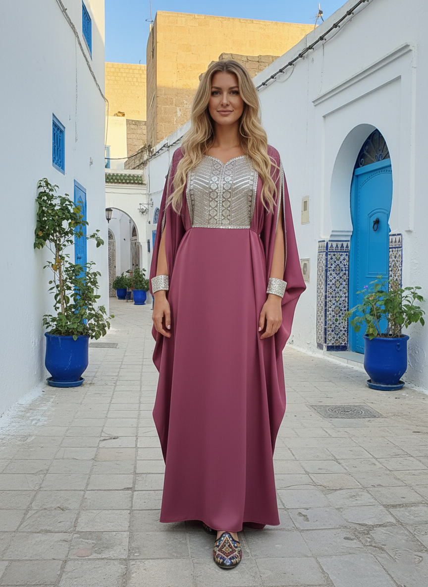 Featuring elegant slit-detail sleeves that allow for graceful movement, this piece is crafted from a premium fabric that flows effortlessly as you walk. Whether attending an upscale wedding, a festive gala, or a sophisticated evening reception, this outfit offers a perfect balance of comfort and luxury. Every detail, from the metallic needlework to the vibrant hue, is curated to ensure a standout and polished appearance.