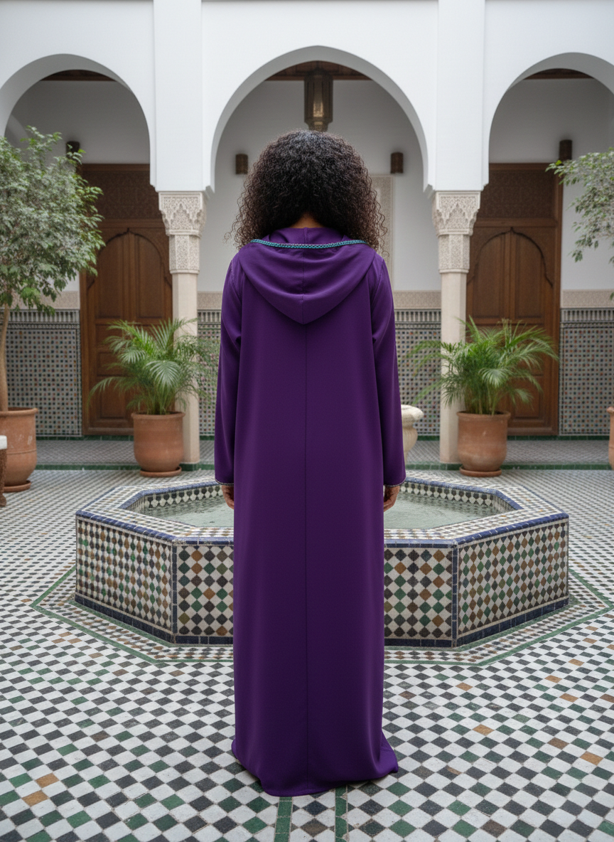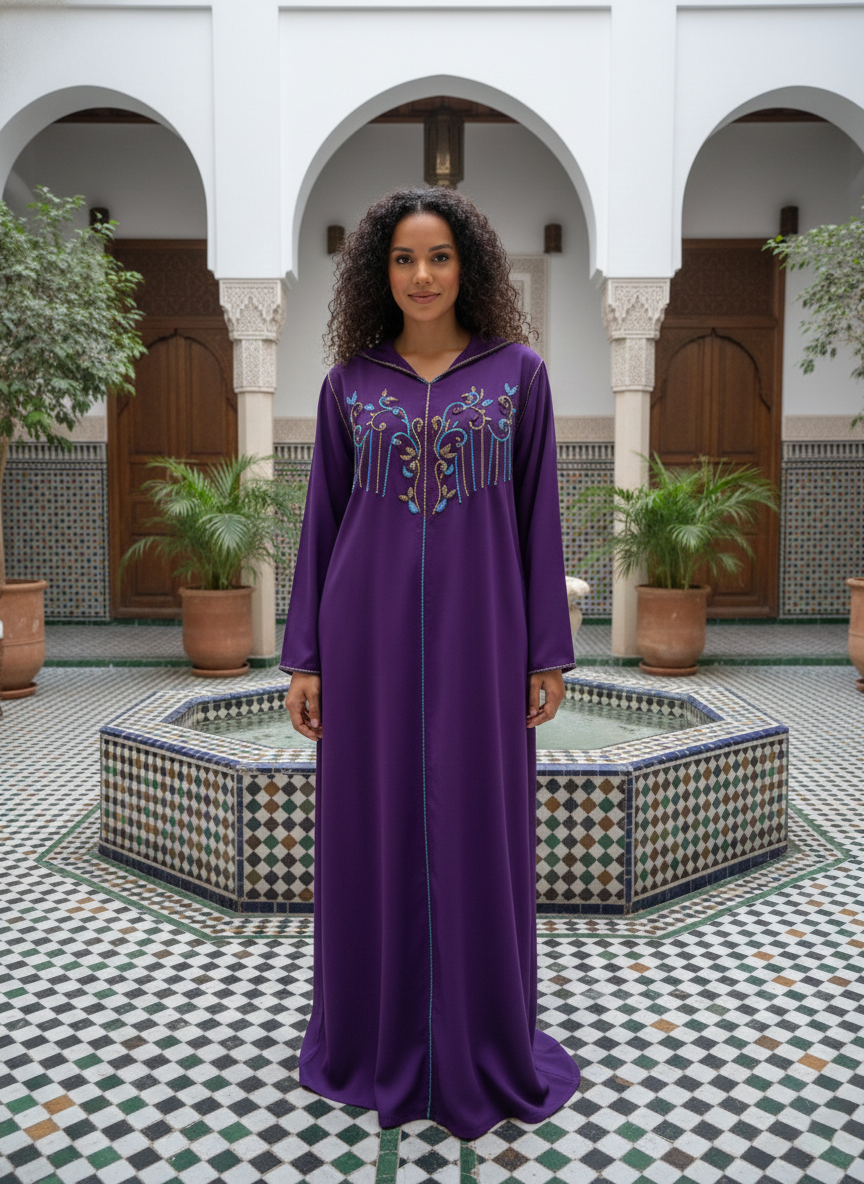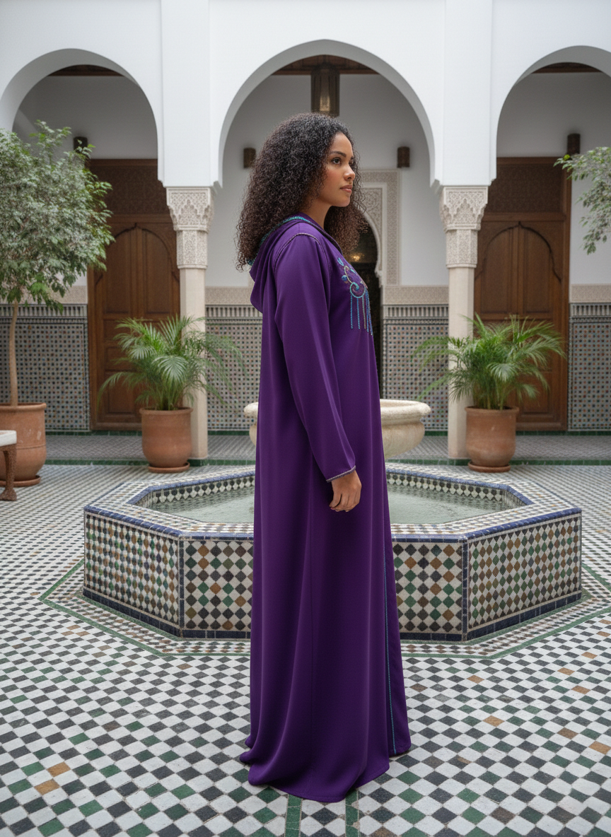 Step into a world of refined grace with this Azure Lilac hooded ensemble. This set features a striking long jacket in a deep, vibrant lilac, characterized by a structured hood and an elegant floor-length drape. The design is defined by intricate teal and gold embroidery that accents the neckline, flowing into delicate handcrafted vertical detailing that adds a sophisticated, modern touch to a classic silhouette.