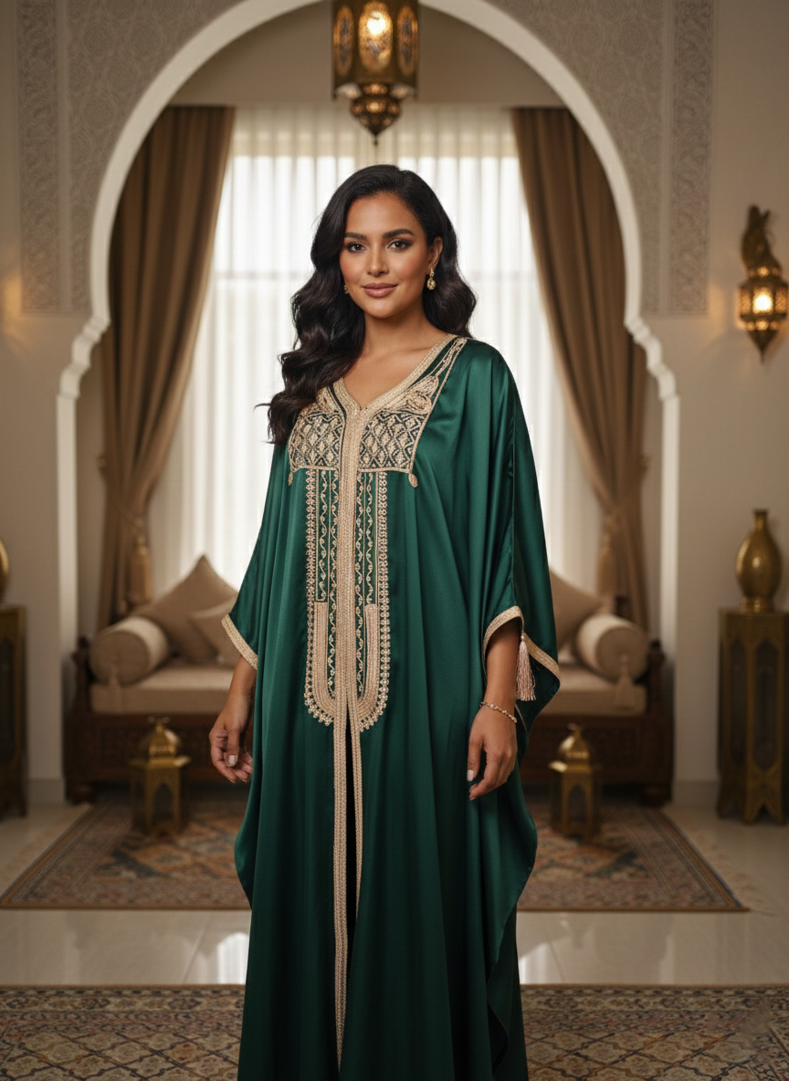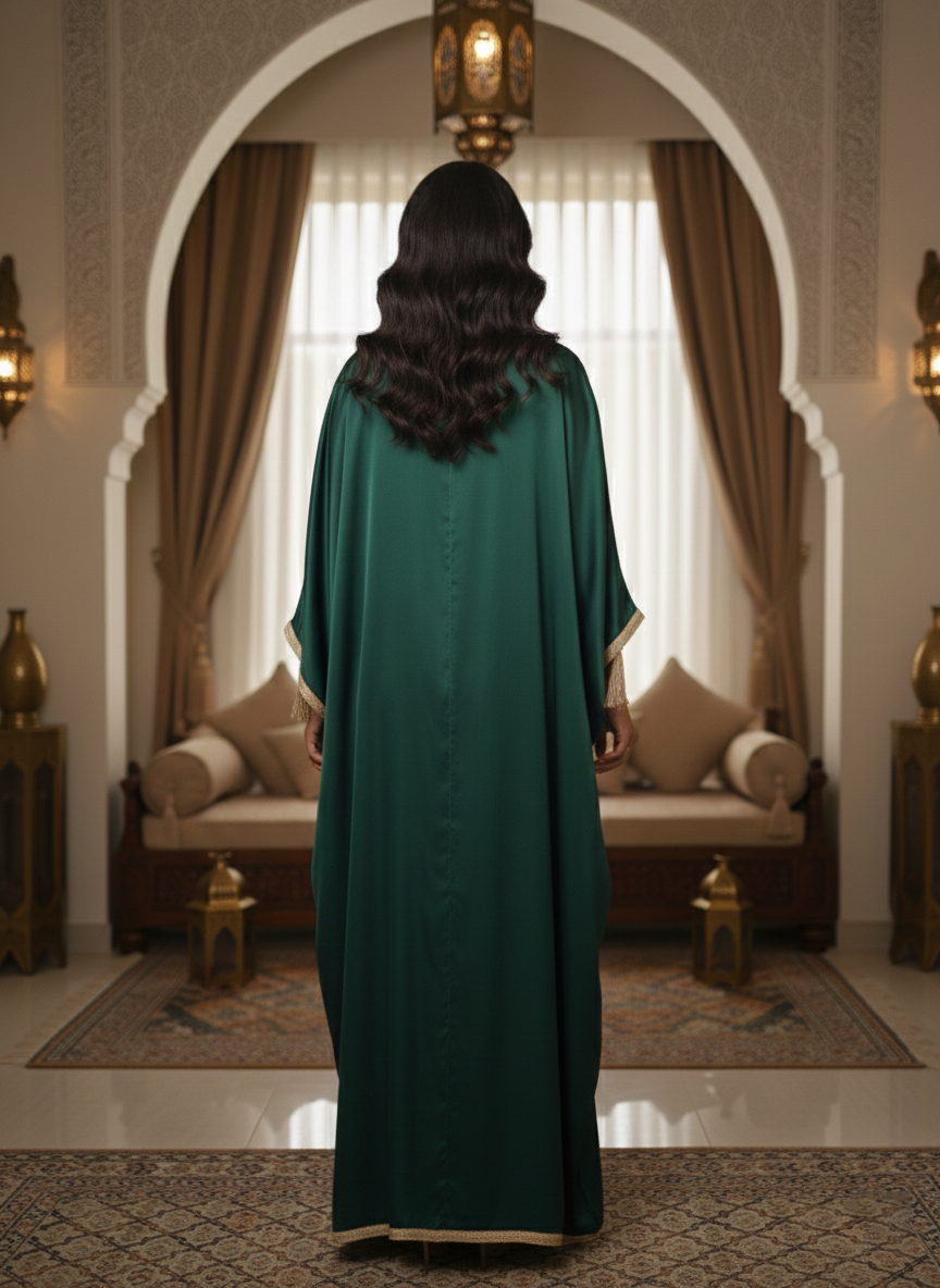 The Emerald Mosswood Kaftan is a luxurious single piece ensemble that radiates deep, jewel-toned elegance. Featuring a rich emerald green front-open outer layer and a matching inner slip, this garment offers a graceful, high-fashion silhouette for grand celebrations.