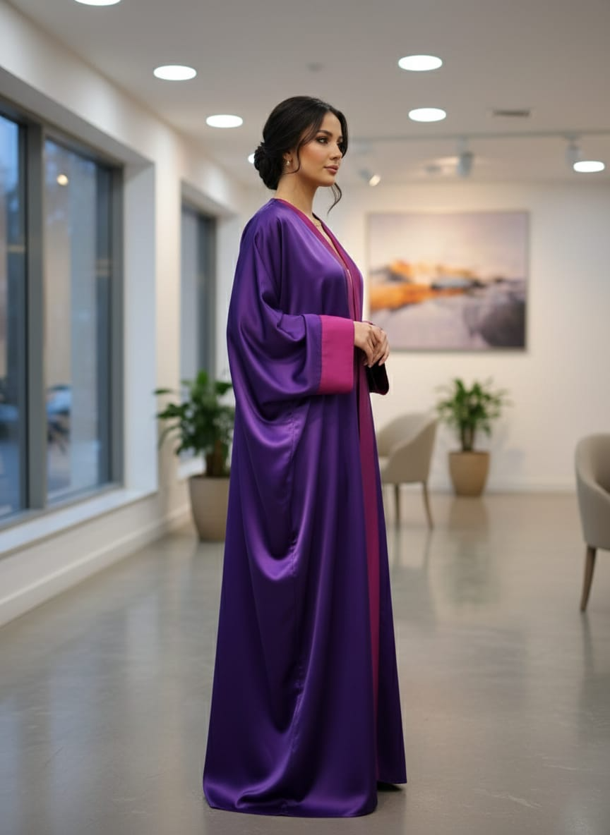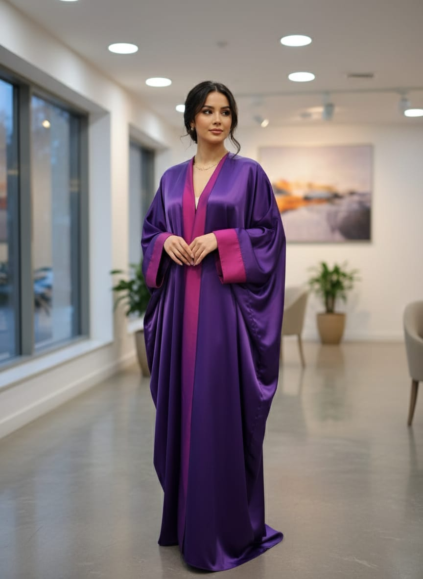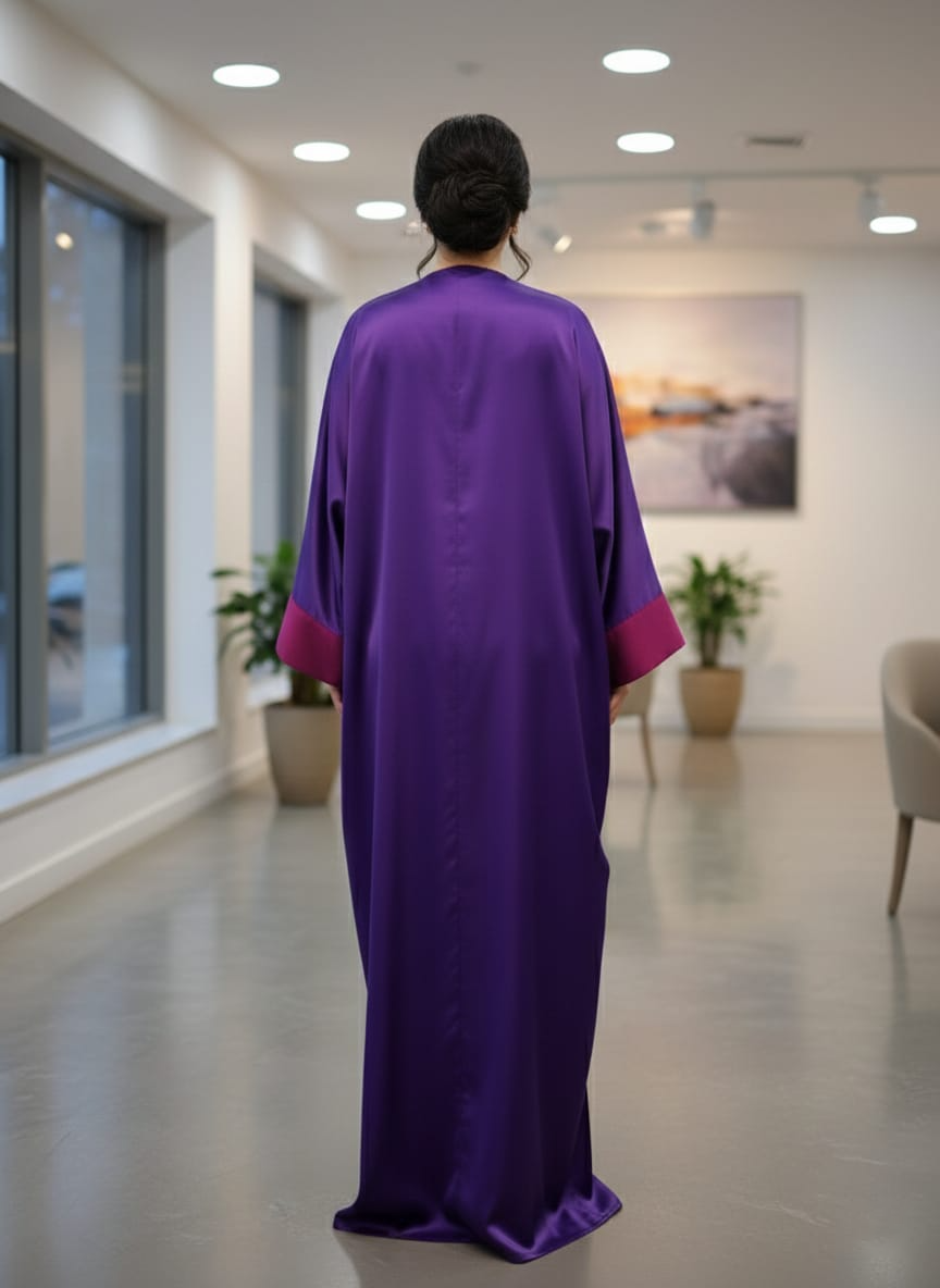 The Lavender Mist Kaftan is a sophisticated single piece ensemble that blends deep purple tones with a vibrant magenta accent. This front-open design features a luxurious silk-satin finish that catches the light beautifully, creating a sleek and modern silhouette for any high-fashion event.