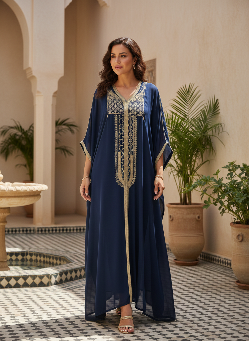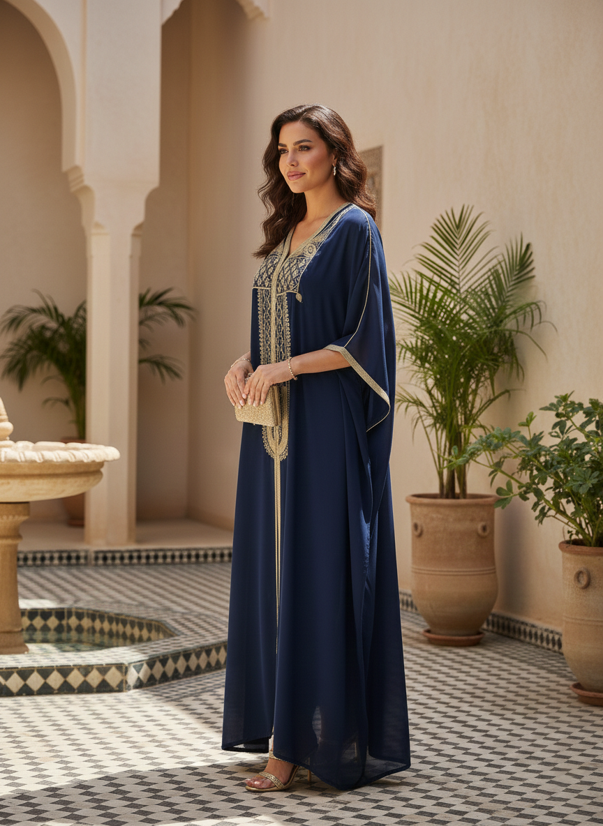 The Navy Celeste Kaftan offers a sophisticated single piece aesthetic, featuring a deep navy front-open outer layer paired with a matching full-length inner slip. This layered design creates a graceful, flowing silhouette that provides both comfort and a high-fashion presence for any formal occasion.