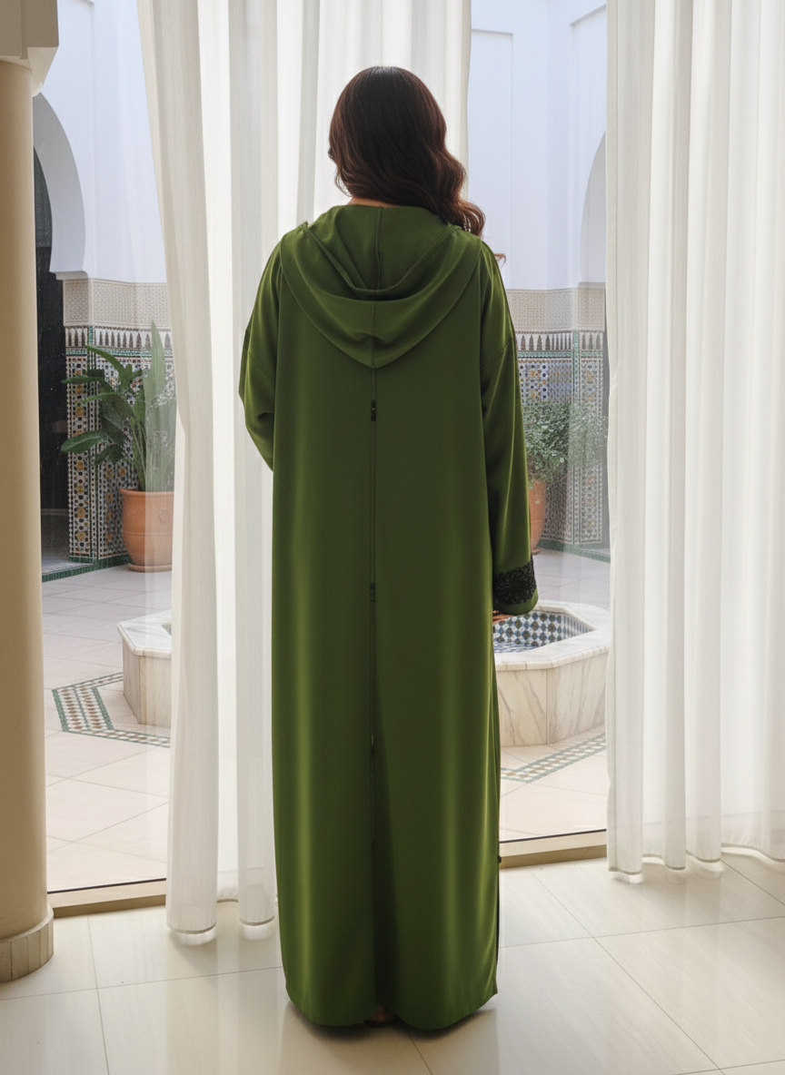 Embrace a fresh, organic aesthetic with our Olive Green hooded ensemble. This set features a long jacket in a vibrant, deep moss green, designed with a clean-lined hood and an elegant floor-length silhouette. The design is anchored by intricate dark embroidery at the neckline and cuffs, providing a sophisticated contrast that highlights the rich, natural tone of the fabric.