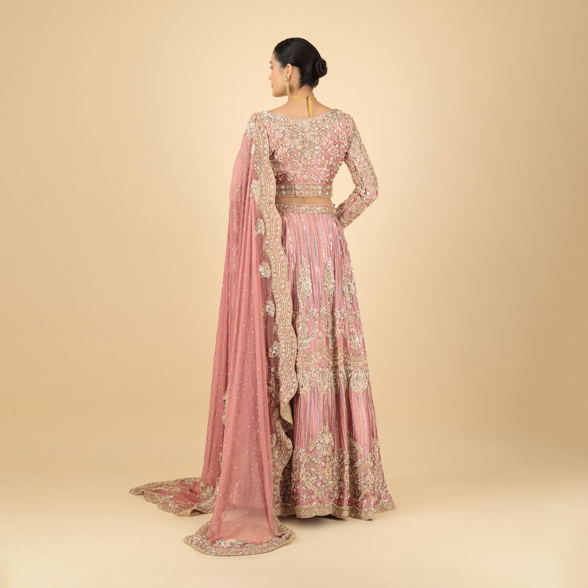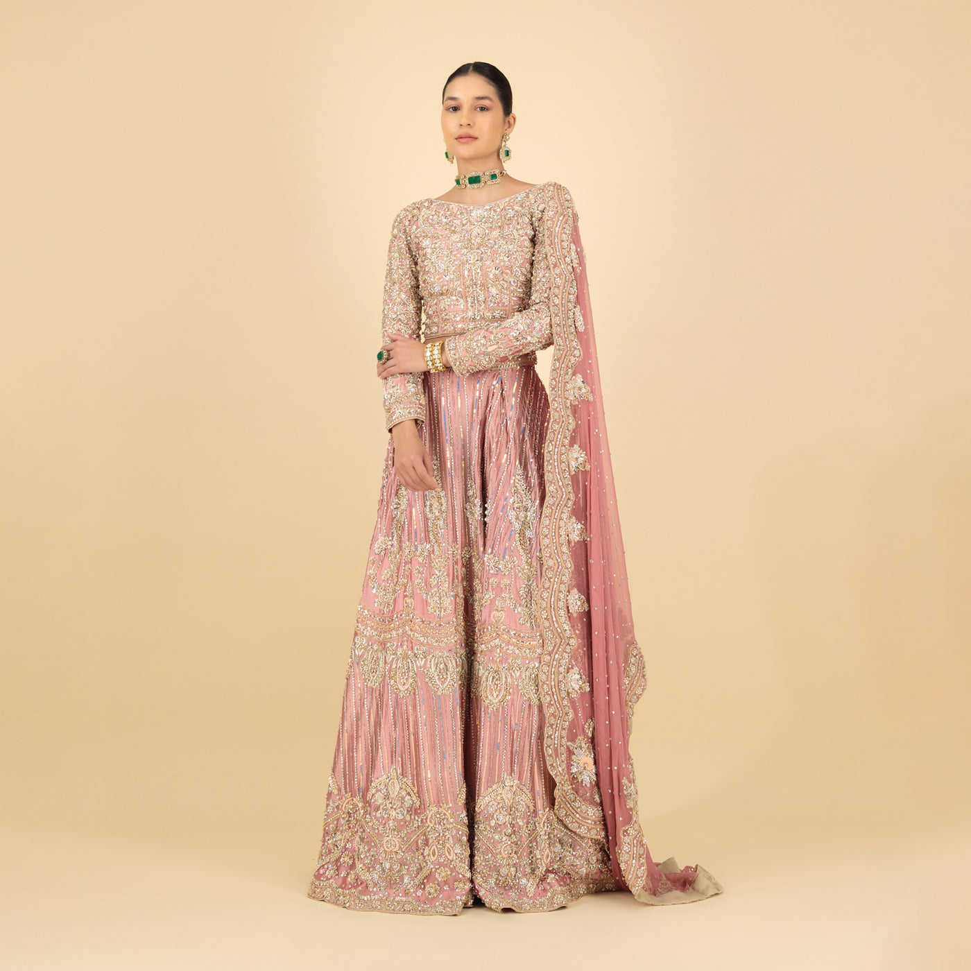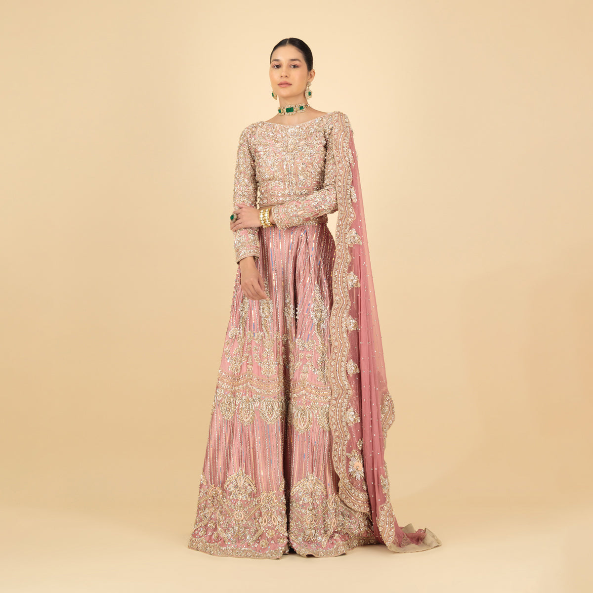 Unveil the essence of bridal majesty with Flamingo Lahjat, a handcrafted marvel in soft blush rose—where every detail whispers royalty. This ethereal lehenga set is tailored for the bride who seeks poise with presence, blending delicate tradition with a radiant modern spirit.
