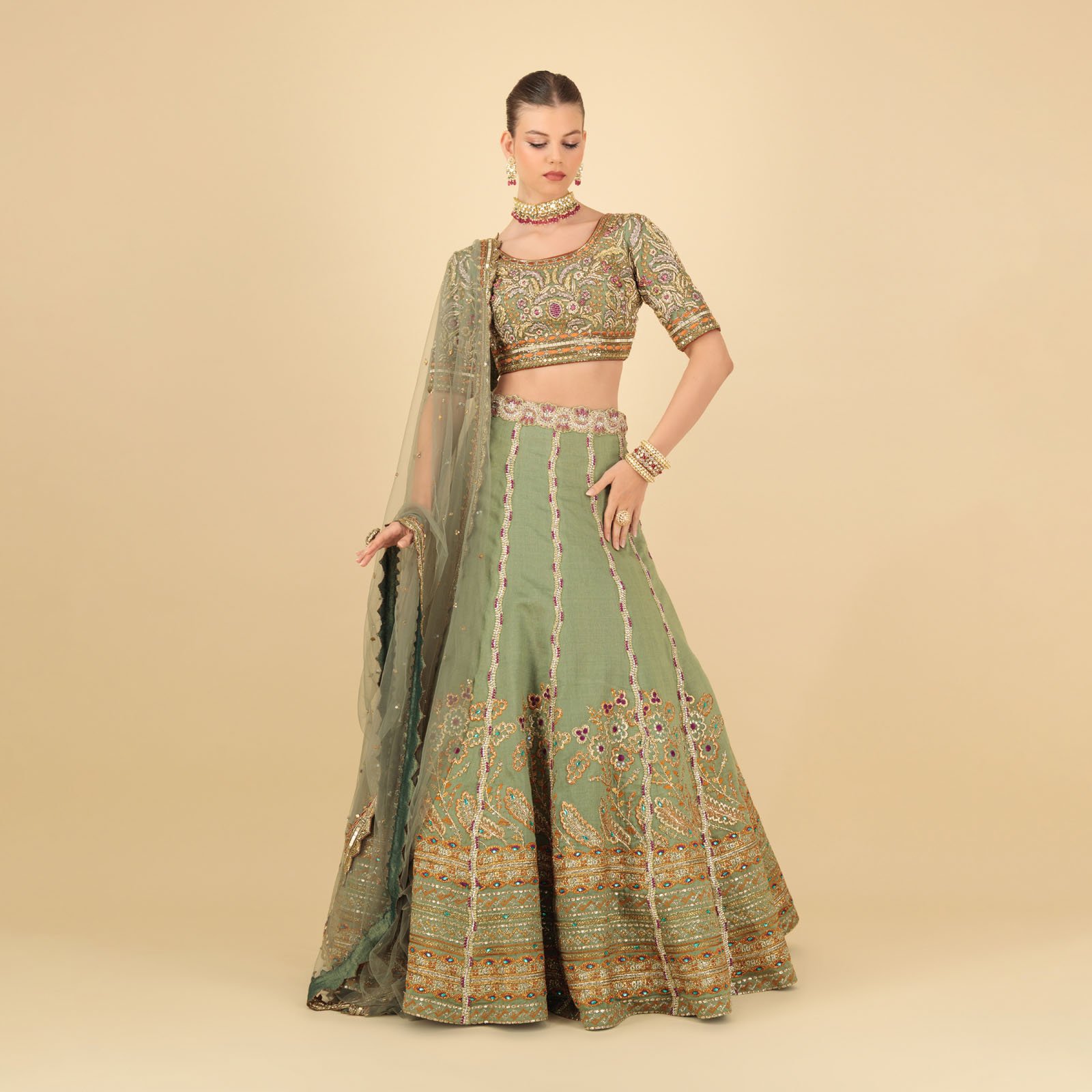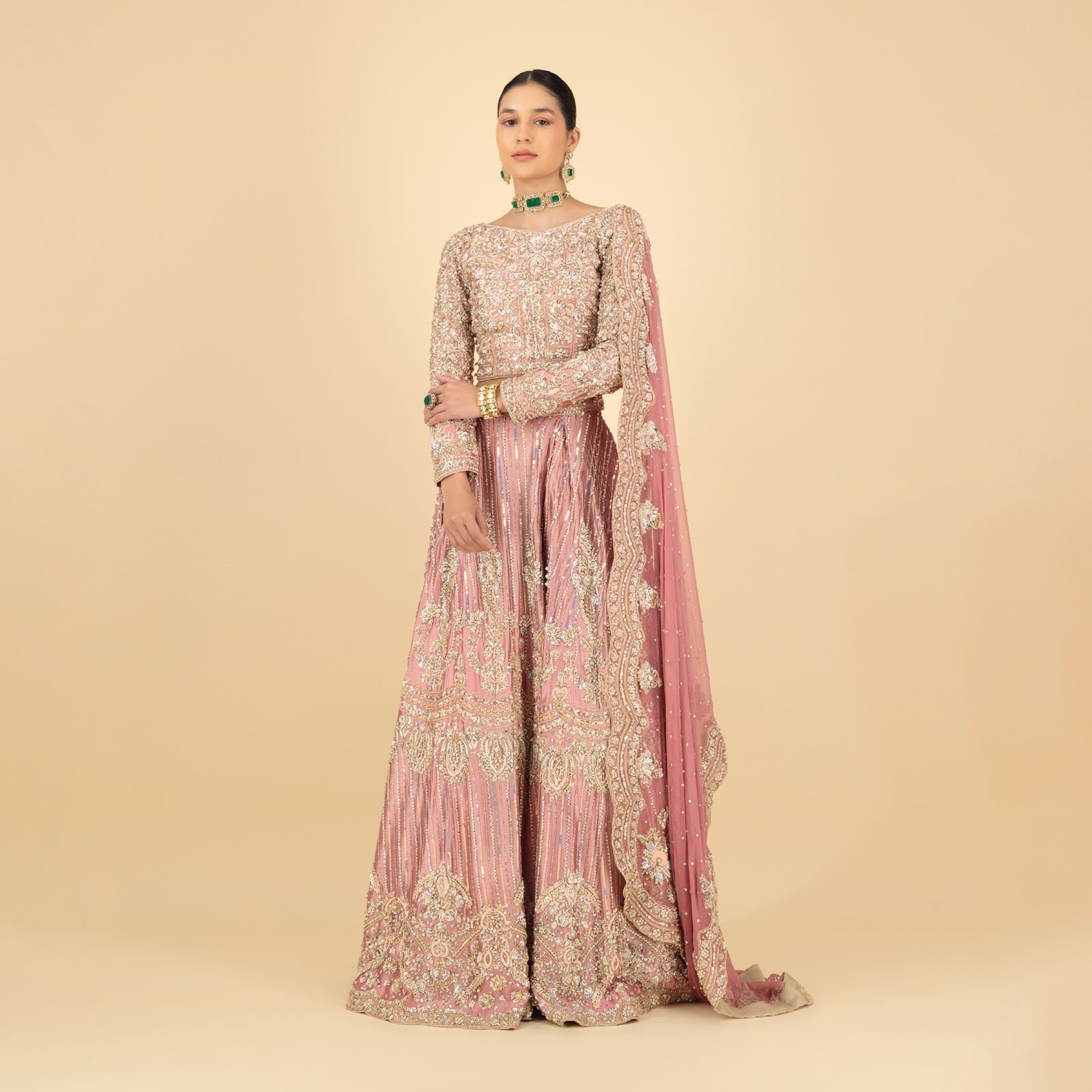 Paired with a soft net dupatta, delicately bordered with shimmering embellishments, the look is both grounded in tradition and lifted by modern finesse. The dupatta drapes effortlessly, balancing boldness with subtlety.
