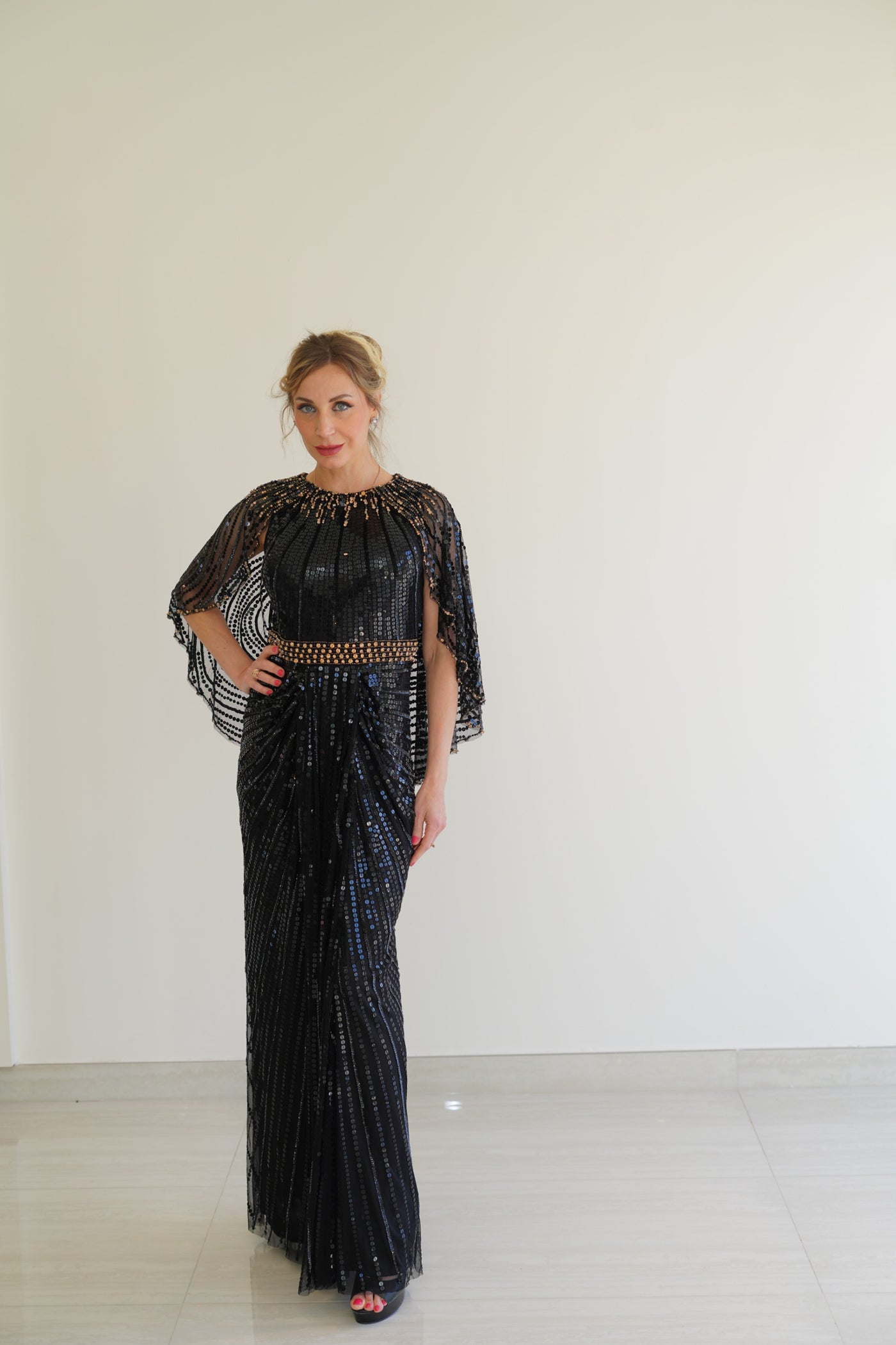 The silhouette begins with a dramatic cape-style overlay, transforming every movement into poetry. Cape sleeves cascade effortlessly from the shoulders, lending fluidity and drama, while the front is expertly draped at the waist — a subtle nod to Grecian artistry — and cinched with a finely embellished belt that defines the waistline like a jeweled embrace.