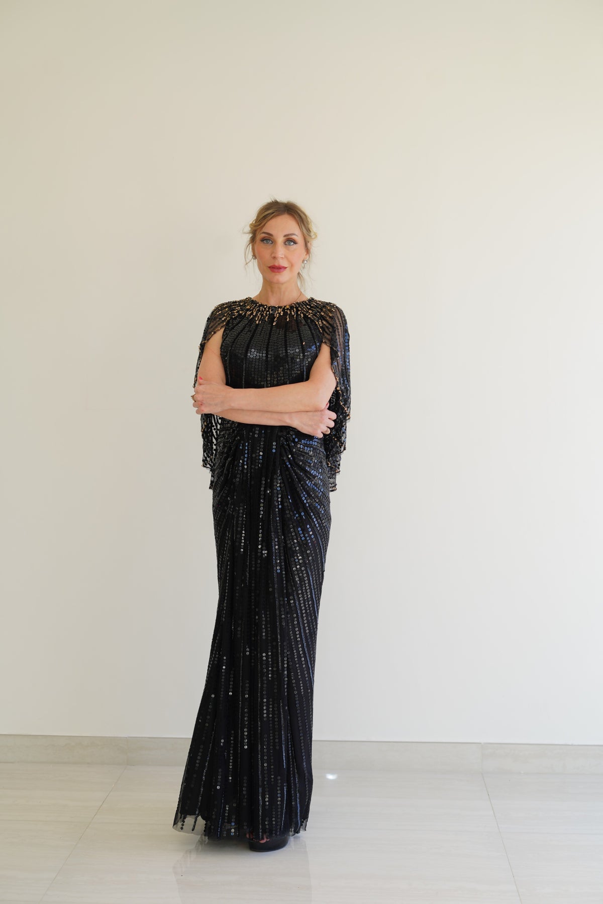 The straight-fall skirt features gentle pleating, offering both comfort and architectural structure. Rich embroidery, mirror-like sequins, and micro-beading form intricate geometric patterns across the fabric, catching the light with every movement and whispering luxury in every detail. The embellishment doesn’t merely decorate — it defines, telling a story of meticulous craftsmanship and modern sophistication.
