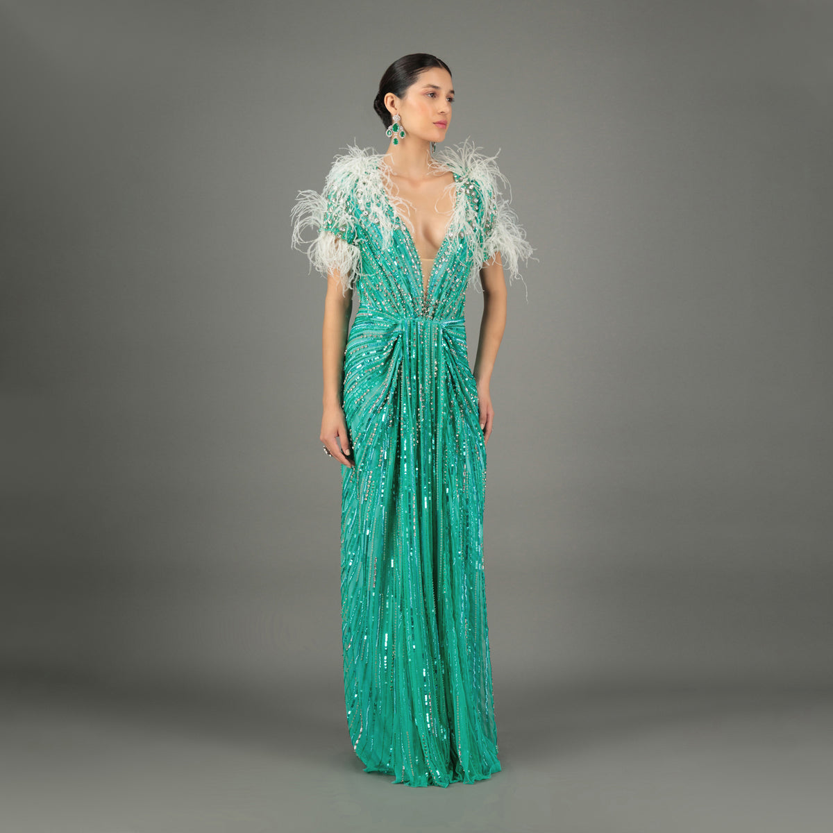 Introducing Fern Flutter by Kamile Haute Couture — a captivating emerald green couture gown that fuses timeless elegance with bold, modern artistry. This floor-length statement piece features a daring plunging neckline and is brought to life through an exquisite blend of shimmering sequins and weightless feather embellishments.